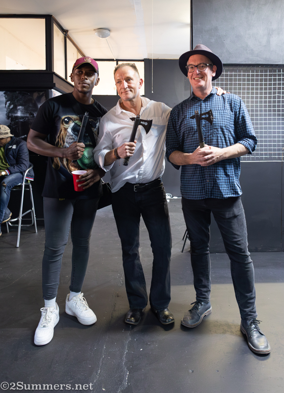 Thorsten, whose self-assigned axe-throwing name was Axe-skies (sorry, this name will only make sense to South Africans) made it to the finals and was the only competitor to hit the corner dot in one of his throws, which thrilled me as his girlfriend. He also had to throw the axe blindfolded, which was not successful and terrified me as his girlfriend. Fortunately Thorsten survived, but he didn’t win: Axe-skies was narrowly defeated by a competitor named Axe-imus Prime. Everyone went home happy.