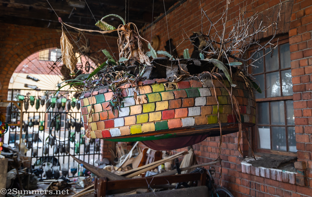 The row of painted mannequin legs harkens back to the building’s former role as a limb factory. The two plastic white bros, sporting scuba goggles, sunglasses, and Mardi Gras beads, floating in a sea of dusty Corona bottles, form an installation called Sink or Swim. A wall of purses and wallets, which were stripped of their cash and cards long ago and now have plants sprouting from them, were left on the streets by petty thieves. There are shelves of dried food – corn cobs and African cucumbers and mysterious seed pods and orange peels dangling down in curly-Qs – recognizing the nutritional bounty of Africa. Delicate strings of colorful bottle caps drape around like fairy lights. Plants line the walls, hang from the ceiling, and grow from porcelain toilets and sinks. Everything growing is composted.