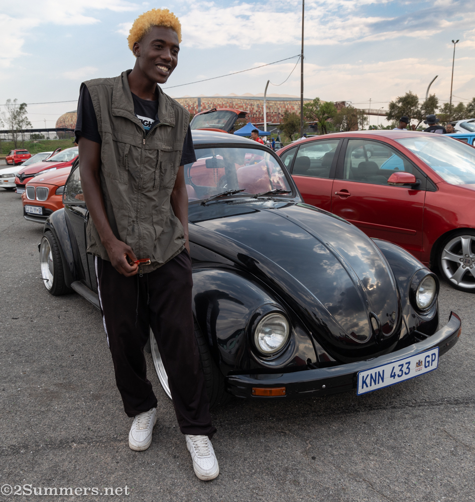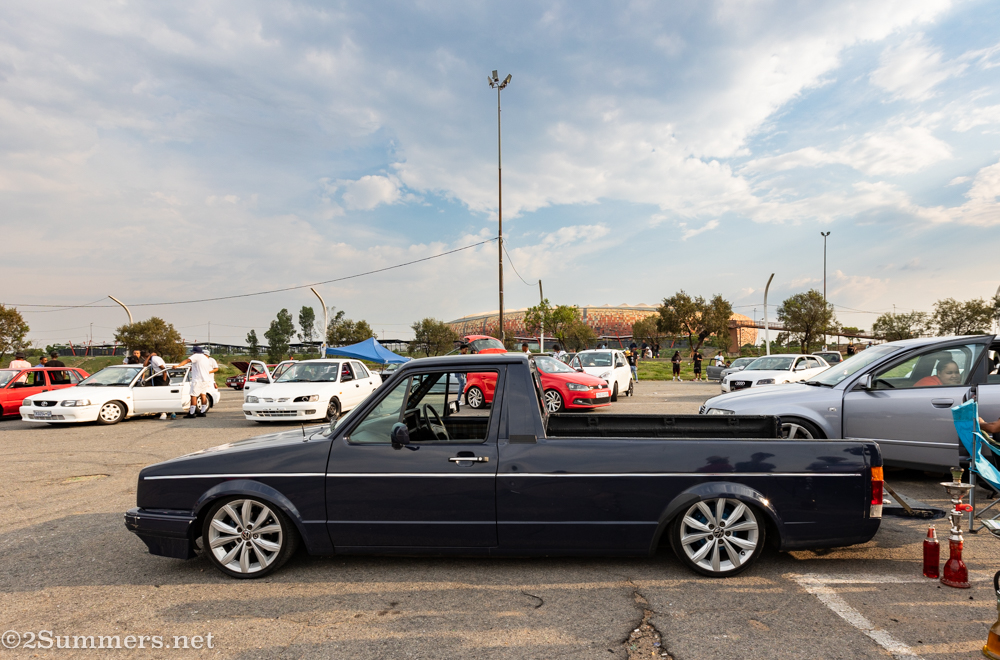 Bluetooth, ready to pair.Tall man, short car.This VW Beetle has one of my favorite interiors.Stance reflections.This car wins the 2Summers Park-Off award for prettiest color scheme – love it.The upholstery evokes the inside of a womb.The 2Summers Park-Off winner for best rims.Percy wins the 2Summers Park-Off award for best dressed, and we found a car that matched him. For more pictures of this car, check out @mikhail_esbaxh.The VW Golf, probably South Africa’s most beloved car, was obviously well-represented at the Park-Off. But stance isn’t limited to vintage VWs and Toyotas. We saw modern Ford hatchbacks, Renaults, Hyundais, Fiats, and many more.I love the low-slung bakkies (pickups).This car’s name is Papa Smurf. (Photo: Percy Zimuto)You may be wondering, as I did, how these cars actually move. I obviously don’t have the technical knowledge to properly explain it, but the cars have air compressor systems that the driver uses to automatically raise and lower the car’s suspension. Nonetheless, we often heard the nails-on-chalkboard sound of undercarriage scraping pavement. Making that sound seems to be part of the thrill. (Photo: Percy Zimuto)I like this color too – hue of a pollution-laced Jozi sunset.Hyundai i10 in the house.Stance sunset.