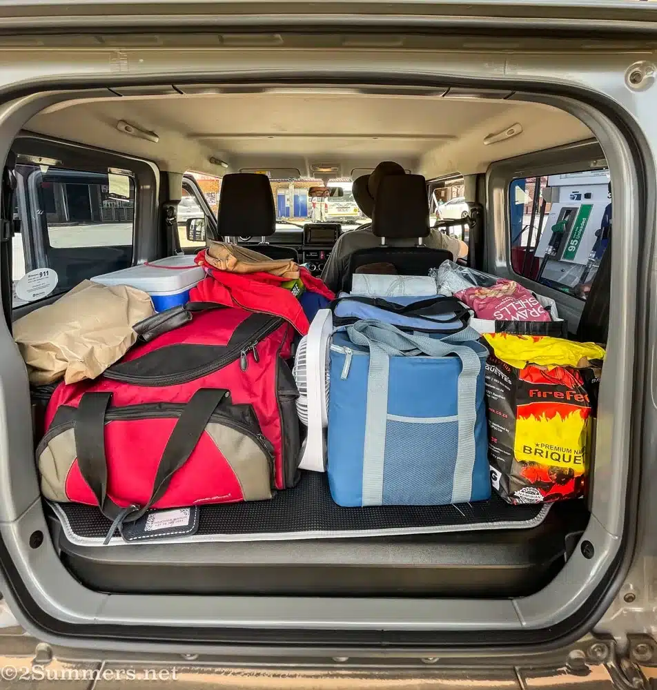 So basically the Jimny has space for two people and a lot of stuff, or three/four people – five, if you really squeeze – and very little stuff. Luckily the seats are easy to fold up and down and the car fits a ton of gear when the seats are folded down flat.