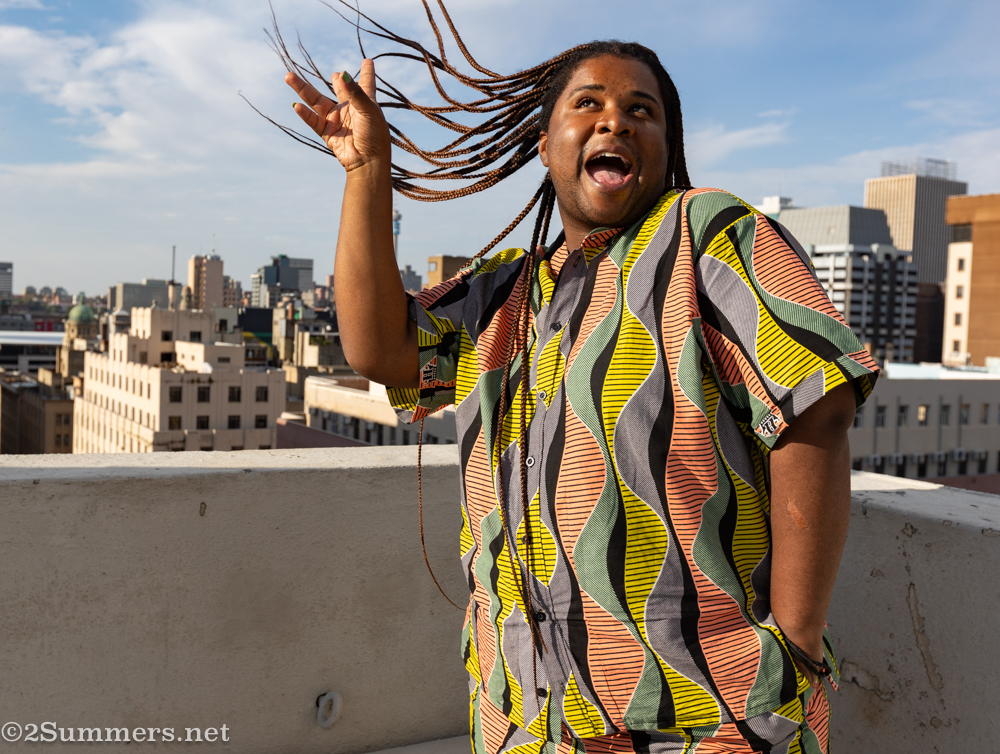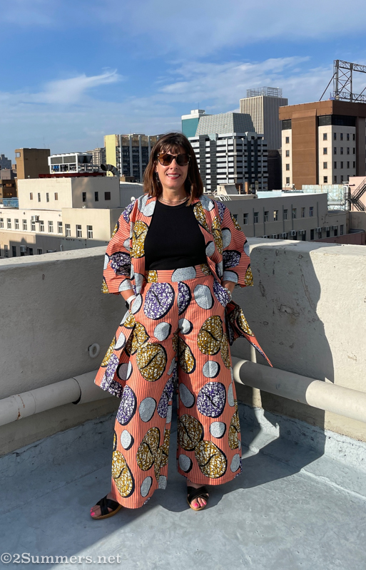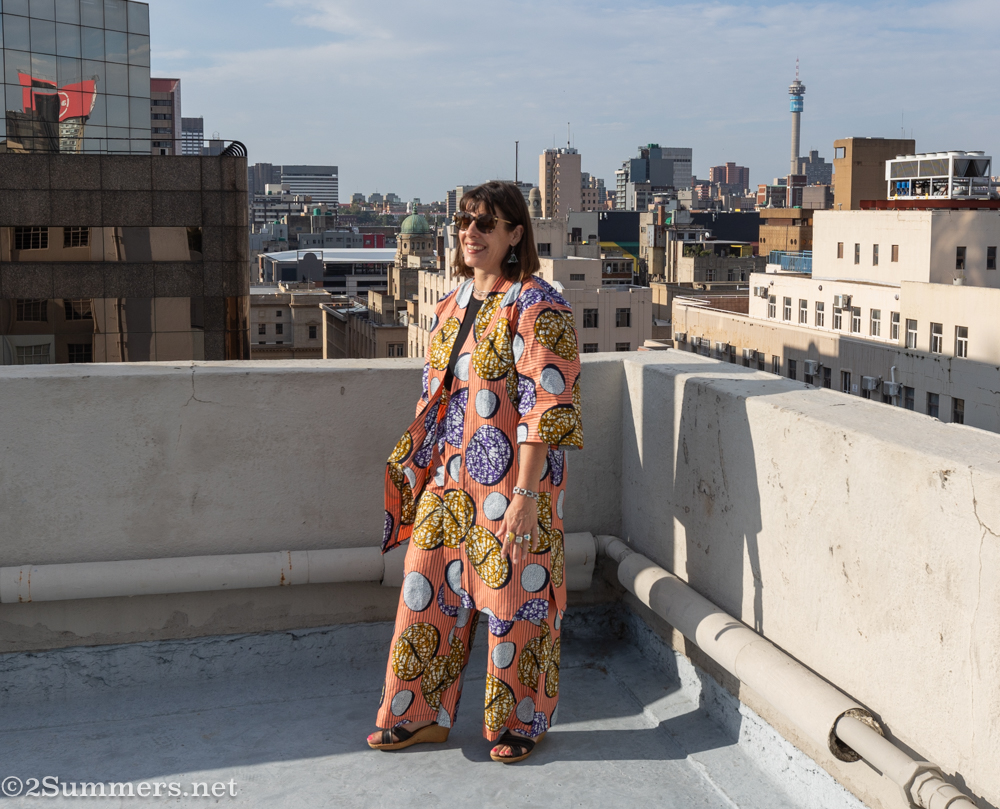 After some introductions, we walked to Noble Fabrics on Troye Street, stopping to admire the Joburg sights along the way. We chose our fabrics – I chose two different prints this time because I had an extra outfit made (more on that later). Then we went back to London House to plan our garments, then went to lunch. The experience culminated in a rooftop photoshoot, which, for various scheduling reasons, Laurice and I did separately on another day.