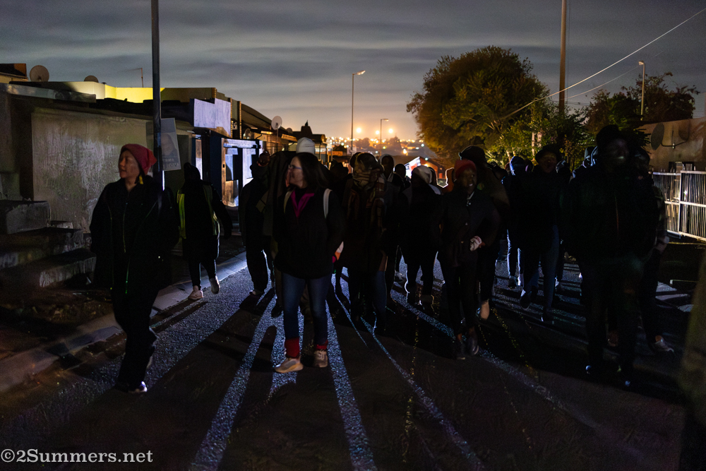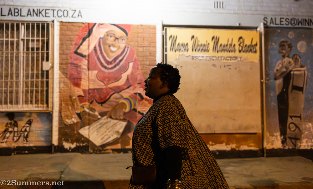 Funk It I’m Walking was founded by artist, activist, and Soweto resident Nomsa Mazwai, who wants to make walking safe for women (and all people) at any time and in any condition. Nomsa is also passionate about promoting tourism, entrepreneurship, and economic empowerment in Soweto. As Nomsa explained at the start of our walk, the ability to walk safely and comfortably after dark is essential for all of the above.
